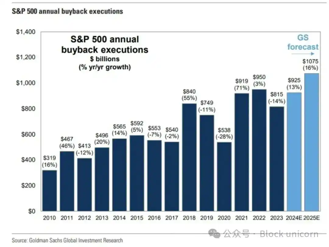 将代币价值与协议收入挂钩的转变并不新鲜。最近几周,几个团队宣布了根据收入按比例回购或销毁代币的机制。其中值得注意的是 SkyEcosystem、Ronin Network、Jito SOL、Kaito AI 和 Gearbox Protocol。代币回购类似于美国股市中的股票回购——本质上是一种在不违反证券法的情况下向股东(或在这种情况下,代币持有者)返还价值的方式。2024 年,仅美国市场就有约 7900 亿美元用于股票回购,而 2000 年为 1700 亿美元。这些趋势是否会持续还有待观察,但我们看到市场明显分化,一边是有现金流并愿意投资于自身价值的代币,另一边是两者都没有的代币。