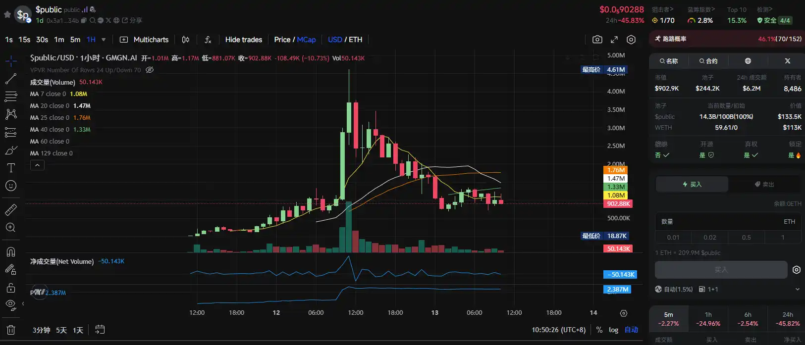 有 Base 高层转发,$PUBLIC 昨日最高市值触及 460 万美元左右。只是这种叙事后劲不足,当前市值回落至 90 万美元附近。
