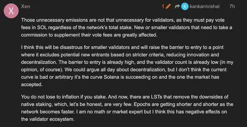 尽管专家们持乐观态度,Solana 社区成员却表达了他们的担忧。例如,验证者 Xen 表示,如果奖励最终偏向那些拥有更多 SOL 的人,那么较小的验证者可能很难赚钱,从而陷入「通胀螺旋」。
