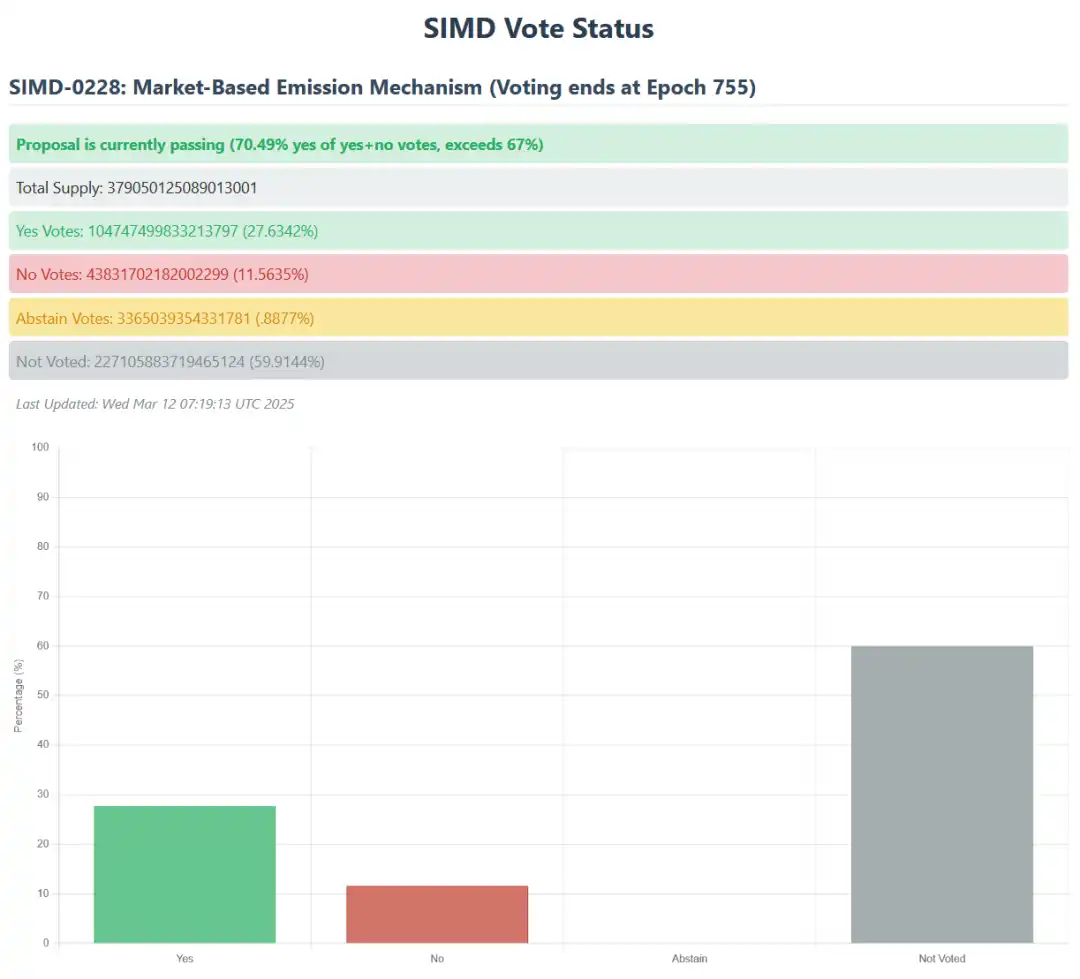 目前,SIMD-0228 正在投票中,投票数已经超过了 33% 达到法定人数,目前赞成率已经超过 70%,投票将持续到 755 Epoch。如果成功通过,它将为其他公链提供「通胀动态化」的参考范式,即使不成功这场治理之争已也深刻改变了 Web3 的叙事:区块链经济的未来,在于代码规则与人性激励的精妙平衡,Solana 无疑正在引领行业行发展。
