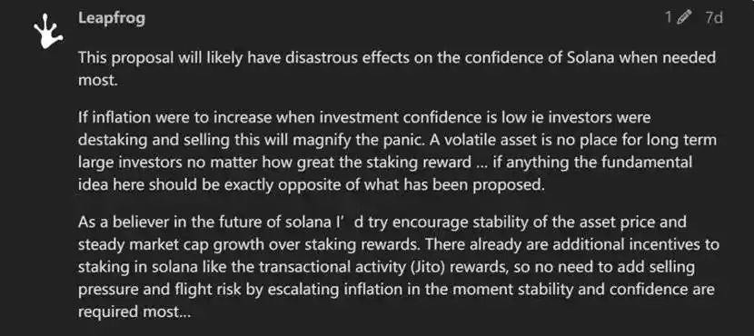 社区成员 Leapfrog 在 Solana 开发者论坛上坦言,该提案「将对 Solana 产生灾难性的影响」。他认为,如果在投资信心低迷时通胀上升,即投资者撤资并抛售,这将加剧恐慌,无论押注回报有多大,波动性资产都不适合长期大投资者。