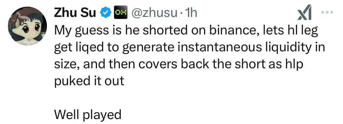 回顾整个事件,我们能够看出这位巨鲸或许在完成这次操作前就已进行多次测试。三箭资本联合创始人 Zhu Su 猜测,该地址之所以能够冒这么大的风险,是因为他同一时间段在 Binance 交易平台做空。相当于多空套保的订单状态,而正是发现了 Hyperliquid 在穿仓时的机制与中心化交易平台不同,才选择从此入手。
