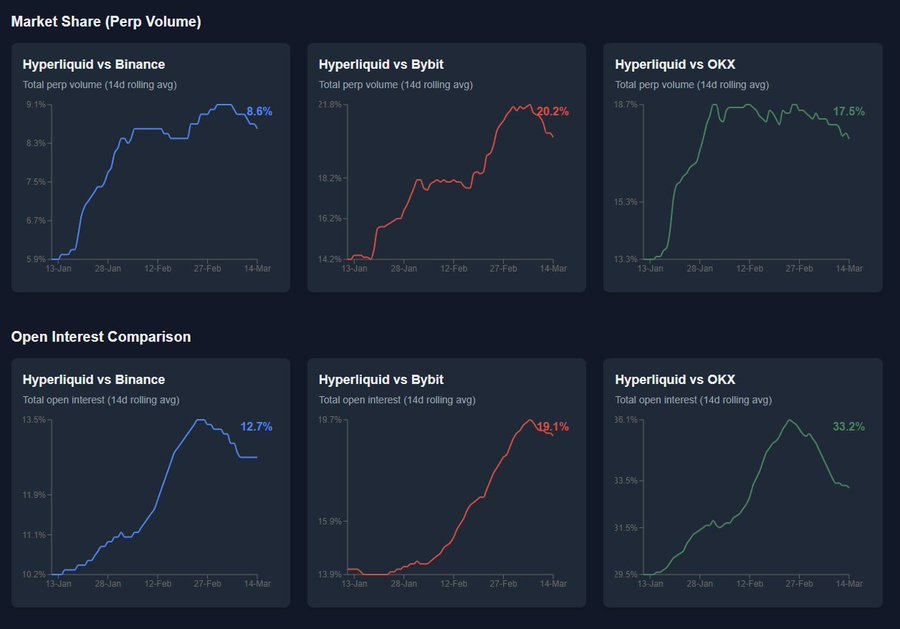 Hyperliquid 已被证明是唯一能够在交易量和未平仓合约上与中心化交易所竞争的永续合约 DEX,并在市场份额上完全碾压其他同类 DEX。这种主导地位主要归因于以下几个原因: