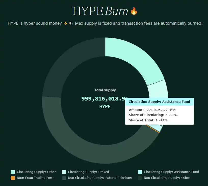 Hyperliquid 的几乎所有交易手续费都会流入援助基金(Assistance Fund,AF)(其余部分流向 HLP),并用于在公开市场上回购 HYPE。目前,AF 持有流通供应量的 5.2%。