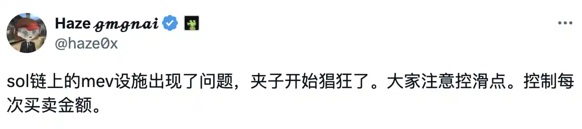 GMGN 联创 @haze0x 也专门发帖提醒大家:「SOL 链上的 MEV 设施出现了问题,夹子开始猖狂了。」