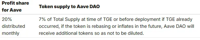 EzR3aL 提到的指南:Aave 的利润分成:每月分配 20%; Aave DAO 的代币供应:在 TGE(代币生成事件)时或在部署之前(如果 TGE 已经发生)分配总供应量的 7%。如果代币在未来进行重新基准调整或通货膨胀,Aave DAO 将收到额外的代币,以避免被稀释。