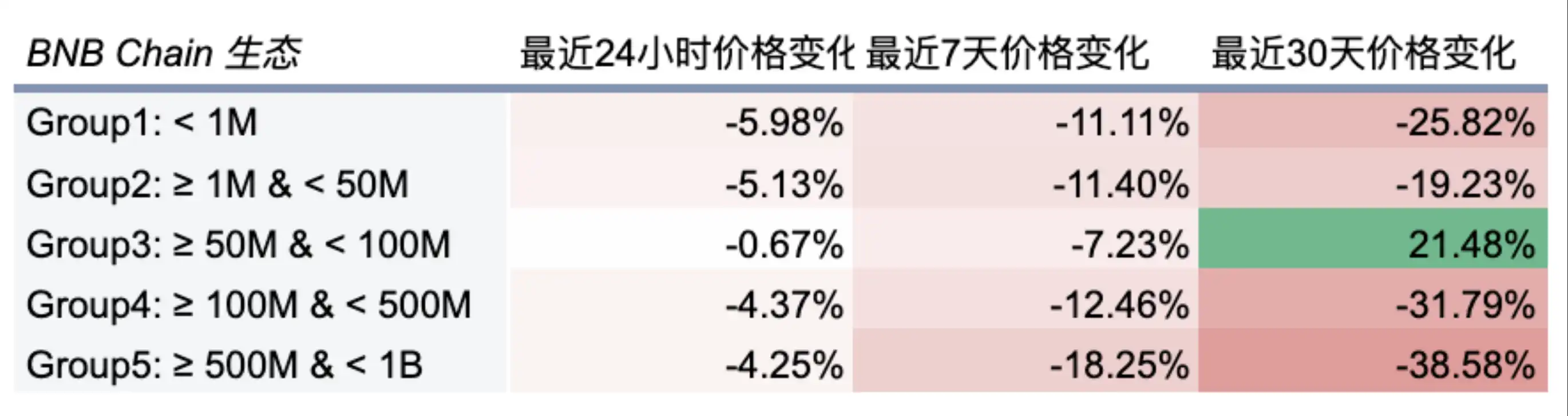 · 从代币价格表现来看,大小币都在跌,只有腰部代币有上涨过的趋势。另外,Meme 很可能因为这段期间的流动性激励计划,而带来了一些买量,因此在 4 个赛道里表现最好。但是另一个 BSC 关注的赛道 Ai agent,并没有同等趋势,可能意味着