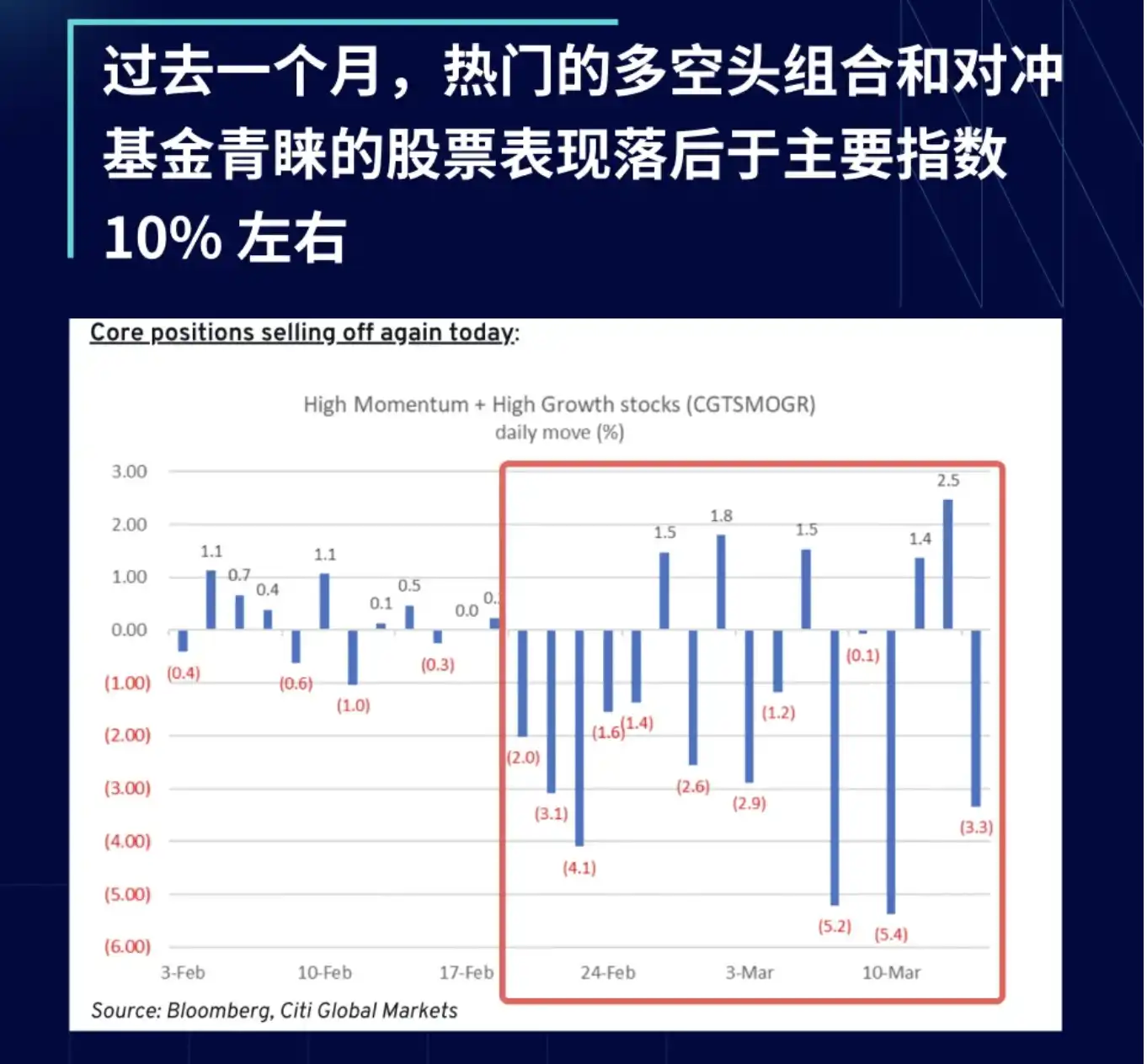 摩根大通的数据进一步支持这一观点,数据显示,股票量化对冲基金的股票风险敞口大幅下降,在增长与动能交易中,热门多空配对策略遭受重创,而追踪最受对冲基金青睐的股票的基金过去一个月的表现落后 SPX 约 10%。