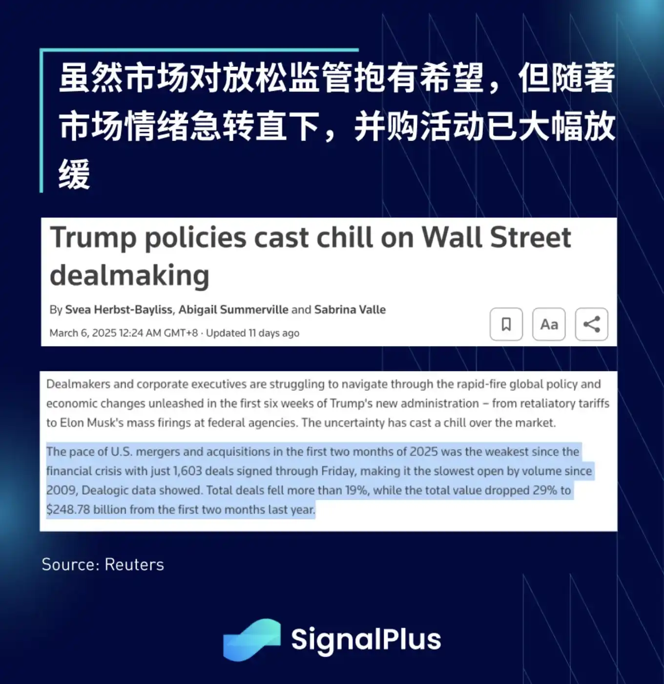 「根据 Dealogic 数据,今年前两个月美国的并购活动创下 20 多年来最不活跃的水平,截至上周五,仅完成 1, 172 宗交易,总价值 2, 268 亿美元。与去年同期相比,交易量与交易规模均下降约三分之一,这也是 2003 年以来交易量最少的开年表现。」—Reuters