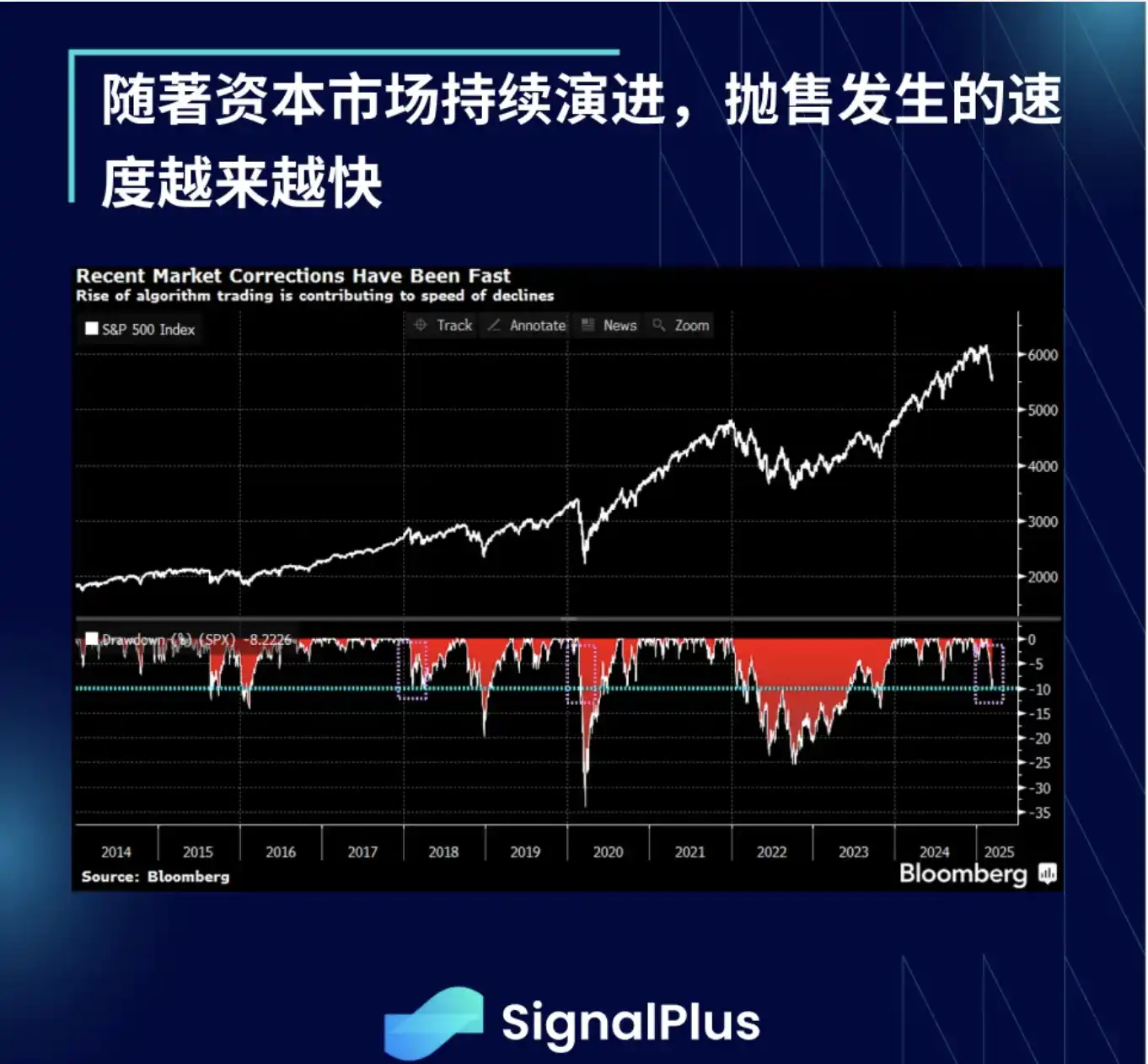 据 Bloomberg 报导,由于自动化交易系统的普及以及严格的风控机制,SPX 指数仅用了 16 天就从近期高点下跌超过 10%,随著技术进步,市场修正的速度越来越快,最近 3 次重大抛售(2018、 2020 以及 2025)都是有纪录以来最急剧的修正之一。