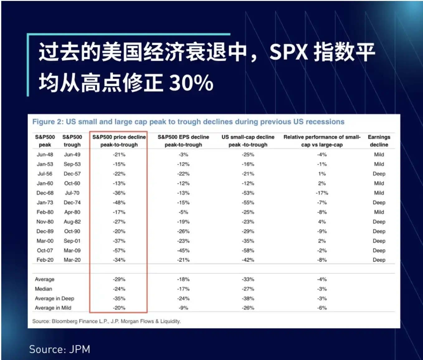 根据摩根大通的数据,过去 12 次美国经济衰退中,美国股市从高点到低点的平均跌幅约为 30%,而目前 SPX 的调整幅度仅为 9.5%。简单的推算表明,股市目前隐含的经济衰退可能性为 33% 左右,大宗商品与美债市场隐含的可能性则接近 50%,而信贷市场隐含的衰退可能性仅为 10%。