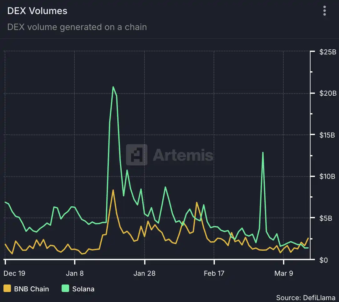 而这次 Meme Szn 带来的效果从数据层面看也让币安收益颇多,首先最显著的就是 Dex 的交易量,在这次周期中一度达到了 Solana 的两倍。