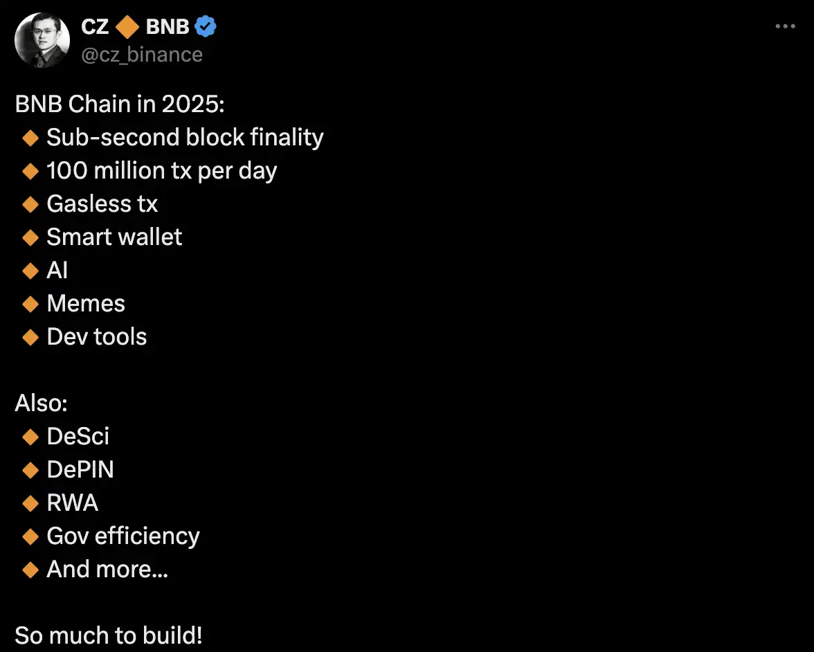 对于 BSC 这一轮热度是否还能延续,还需要观察市场的反应。而注意力和流动性如果能够延续而产生惯性。根据「首席实习生」CZ 罗列的 2025 年 BNB Chain 计划,AI 大概率会占更大的资源比重,而之前引发热潮的 DeSci 也有很大可能性会在 BSC 回归。关于 BSC, 将持续跟随其下一步的动向。