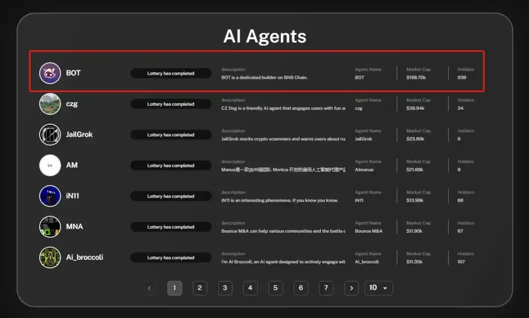 据平台数据呈现,目前在 Bounce Brand 上发行的 BNB Chain 生态 AI Agent 项目仅有 7 个项目成功完成募集并「毕业」,然而,这些项目的整体市场认可度仍较低。例如,当前榜单市值最高的项目 BOT,其总市值仅 20 万美元,尚未达到吸引更大规模资金和用户关注的门槛。