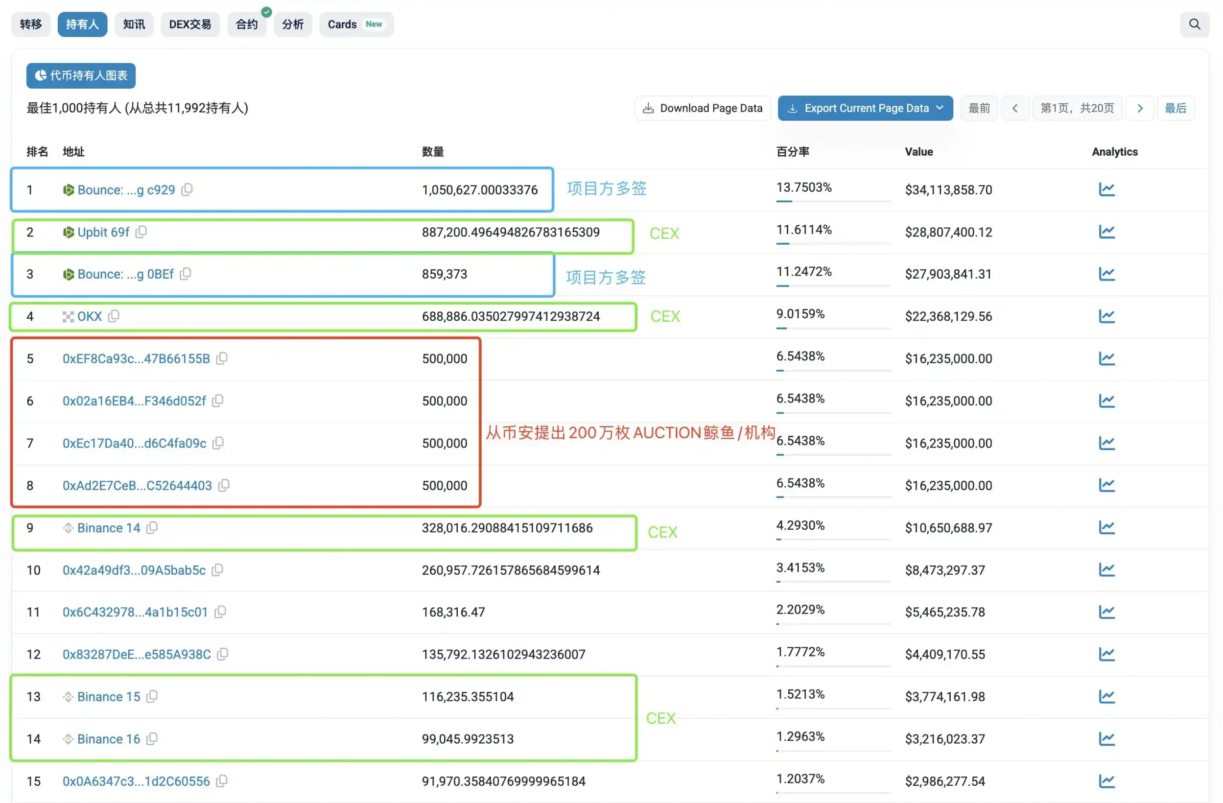 近期从 Binance 提出 AUCTION 的这个「庄家」:200 万枚(占代币总供应量的 26%),这 200 万枚币是在最近 3 周时间里从 Binance 提出来的;项目方地址:191 万枚(占代币总供应量的 25%),项目方两个多签钱包上次转出已经是 5 个月前,估计短期内也不会有操作。