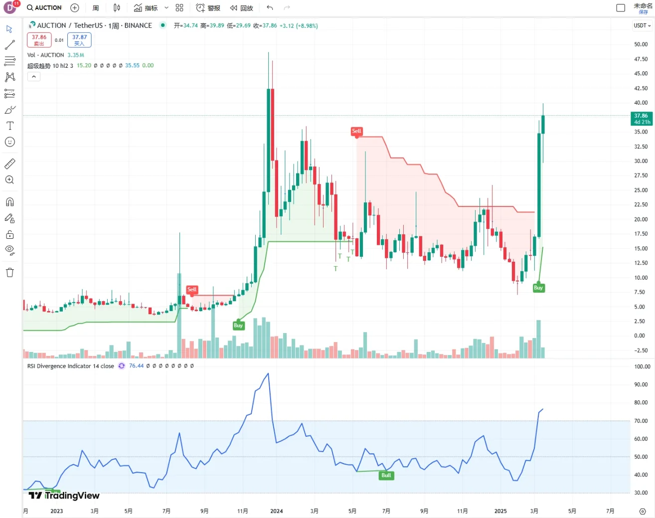 近期 BTC 走势震荡,市场情绪分化,许多山寨币缺乏热度,社区活跃度和二级市场表现均较为低迷。然而,Bounce Brand 生态代币 AUCTION 在此期间逆势走强,展现出卓越的涨幅表现。自 2 月初触及 7 美元低点以来,AUCTION 价格一路攀升,昨晚更是一度突破 40 美元,不仅刷新了过去一年的价格高点,更在短短一个半月内实现超 470% 的最高涨幅,远超市场平均水平。