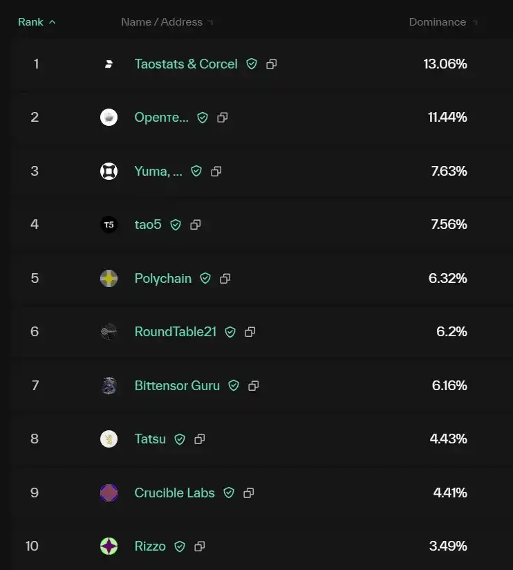 但这种机制也存在巨大的利益驱动问题,尤其是 大验证者(如 Opentensor 基金会、DCG Yuma、Dao5、Polychain 等)掌握了过多权力。
