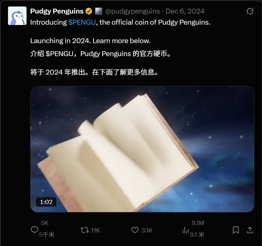 举个例子:当 Pudgy Penguins 推出他们的 PENGU 代币时,他们的营销活动并不是围绕卢卡·内茨或公司成功展开的。相反,预告片一开始讲的是流动性提取者,暗示着许多项目如同一道道光束出现,但在最寒冷的冬天,Pudgy Penguins 却团结起来,在黑暗中创造了光明。