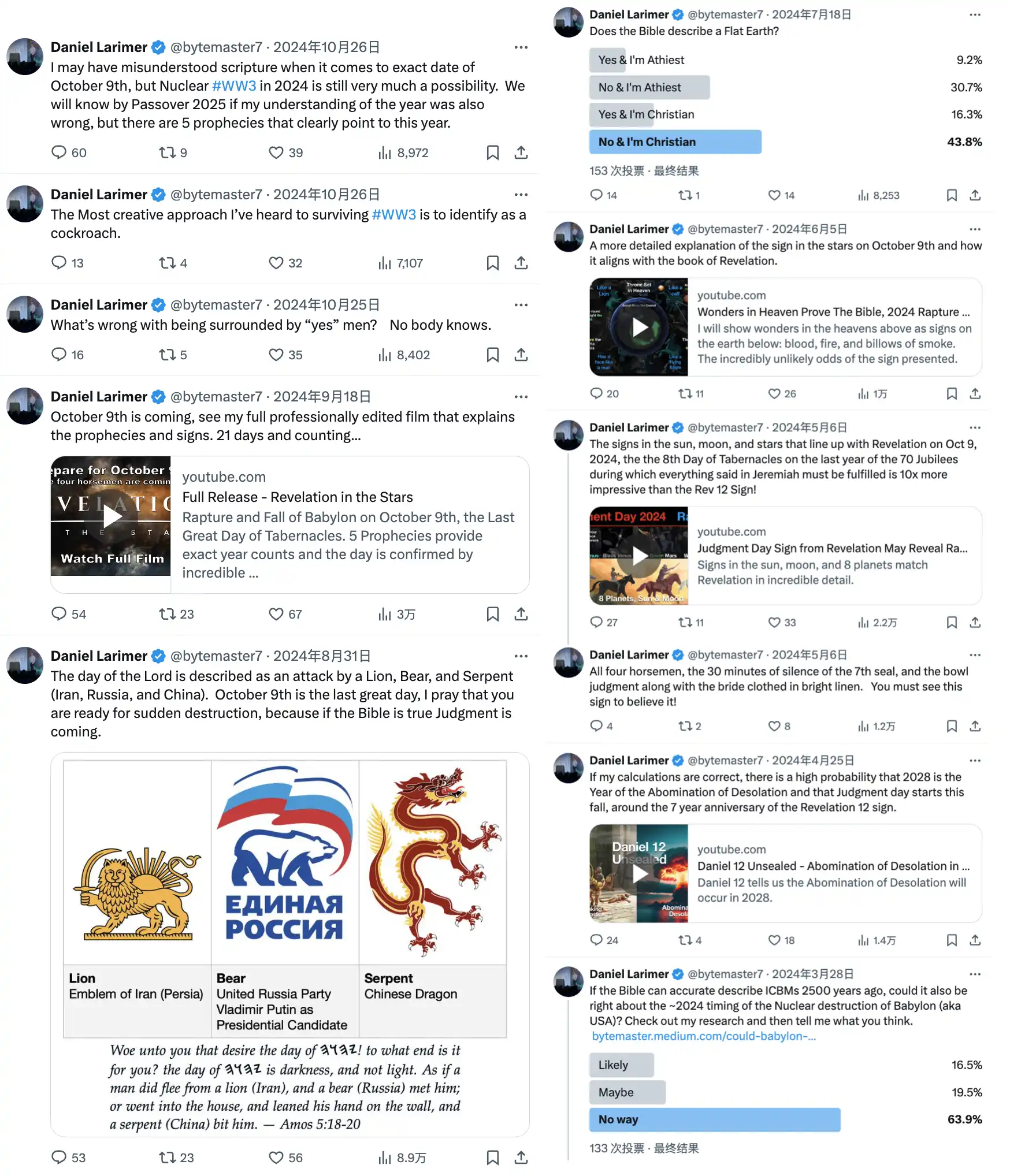 更可笑的是,自 2024 年以来,BM 的推特内容几乎不再涉及区块链,唯一的一次技术讨论只是零星提及数据库优化。相比之下,他的关注点已彻底转向神学的布道,内容高度集中于《圣经》解读、地缘冲突的世界末日预言,以及针对主流基督教的批判……
