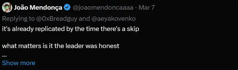 因此,交易被包含的唯一保障就是:信任领导者不会作恶或腐败。