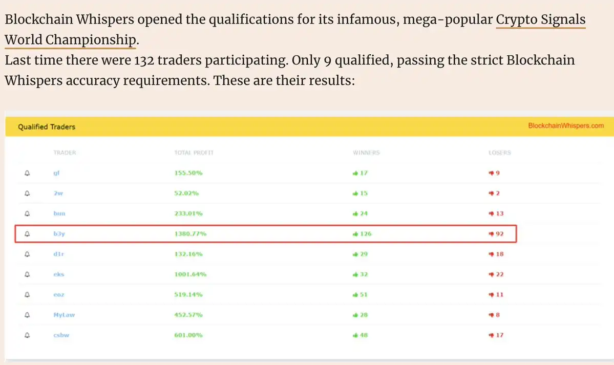 我几乎没睡。但光有知识还不够——我需要资金来交易。于是,我参加了 Blockchain Whispers 举办的全球交易比赛。一个月内 ROI 最高的顶级交易者将赢得 1 个 BTC。虽然主要是模拟交易,但我把它当作生死攸关的事情。