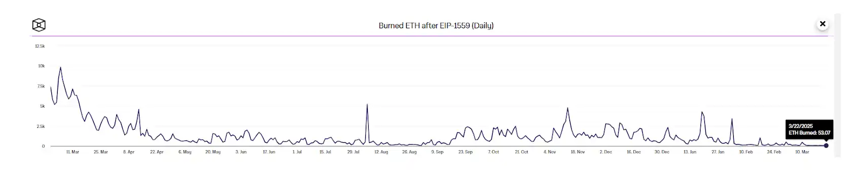 The Block 数据显示,3 月 22 日,以太坊单日销毁量跌至 53.07 ETH(约 10.6 万美元),较 2024 年峰值萎缩 99%,链上交易量、活跃地址数、Gas 费三大指标同步跌至历史低位。