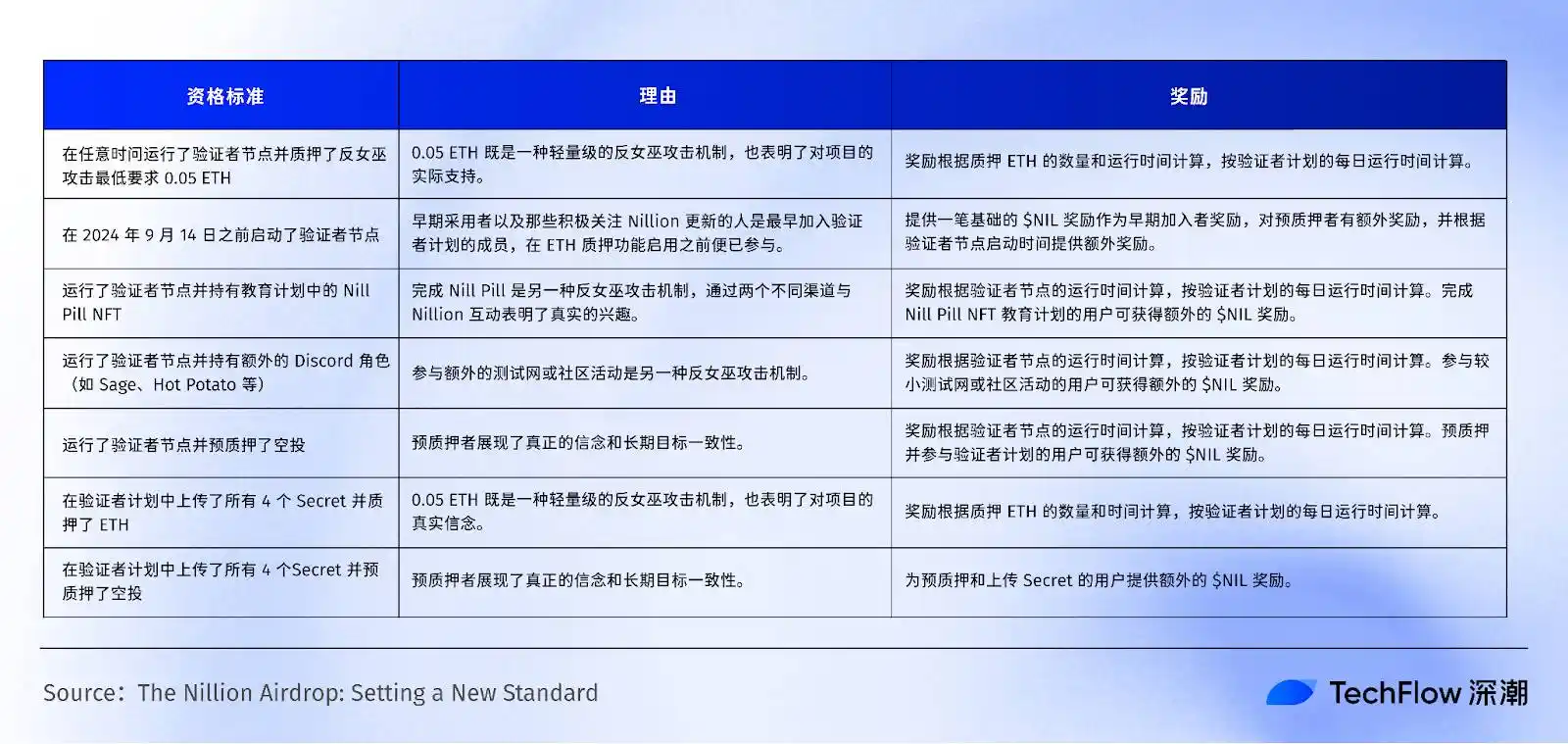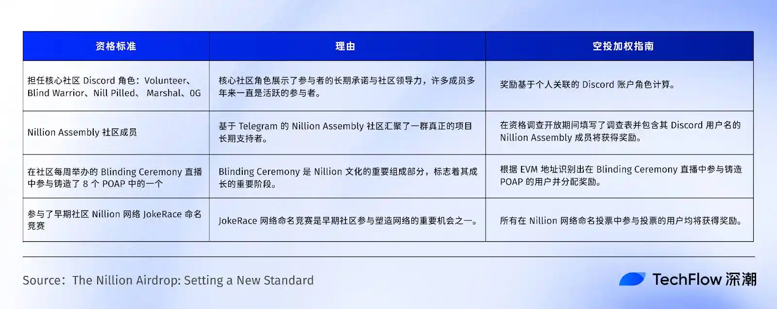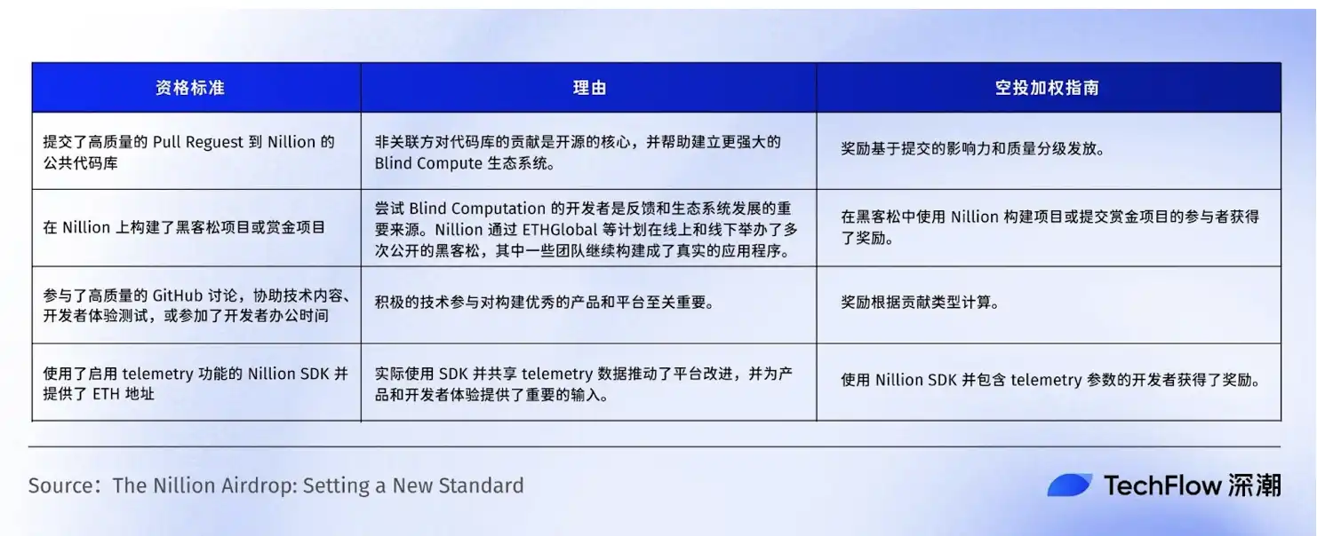 针对每一类群体 Nillion 也都公布了具体的标准,旨在精准识别生态中的长期参与者和真正贡献者,让奖励真正流向对项目产生正向价值的成员。