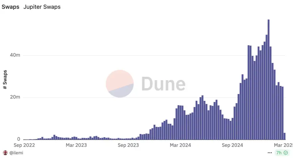 尽管推出了 Jupnet 扩展全链业务,但是 Jupiter 目前的核心业务还都是在 Solana,对于 Jupiter 而言,最大的未知数还是在于 Solana 网络能否维持繁荣,保持活跃的链上交易。