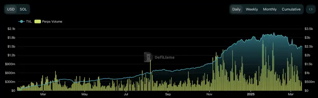 Jupiter 衍生品交易所的 TVL(左轴)和交易量(右轴)数据 来源:DeFillama