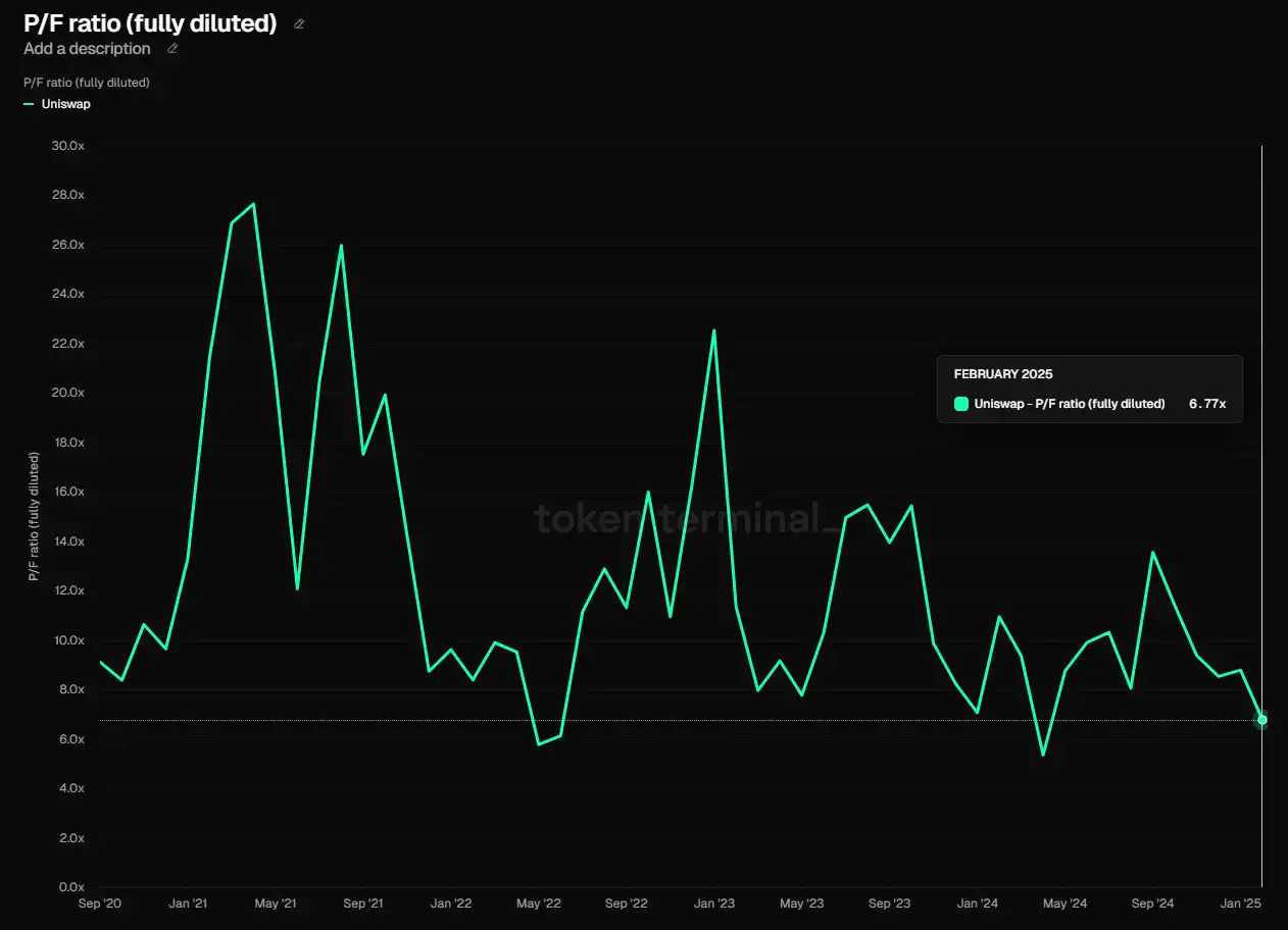 纵向对比来看,Uniswap 今年 2 月的 PF 为 6.77,处在绝对的历史低位,从 Uniswap 发币以来,历史上比这个指标更低的月份仅有 3 个,分别是 2022 年的 5-6 月(三箭暴雷),以及 2024 年的 4 月(山寨币大回调+Uniswap 收到 SEC 的 Wells Notice)。而三月该指标略升至 7.26。从这个指标来看,市场目前显然对 Uni 代币的前景感到极度悲观。