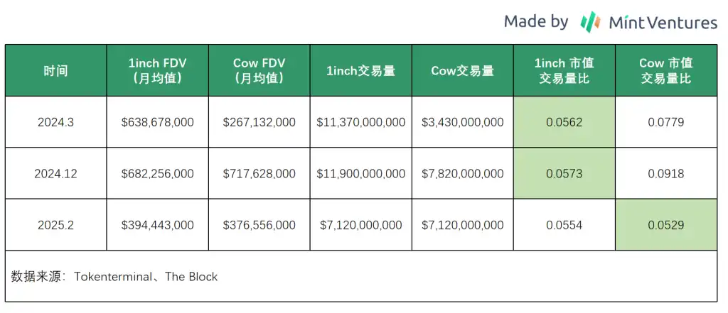 由上图可以看出,随着 Cow 价格的回落和业务数据的上升,其市值\交易量比,从 25 年 2 月开始首次低于了 1inch,拥有了更高的横向性价比。