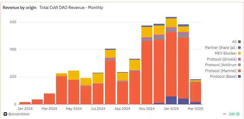 在协议的收入构成中,大部分收入由 Cowswap 的交易盈余分成贡献,所以我们后续关注的业务数据也将以 Cowswap 为主。