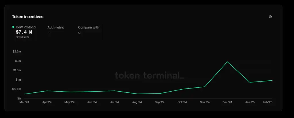 目前 Cow Protocol 的主要开支是面向 Cow Protocol 网络 solver 的 Cow 代币激励,网络 solver 根据自己提供的交易方案的质量(为交易者提供的交易盈余)获得 Cow 代币奖励。根据 Tokenterminal 的统计,过去一年 Cow 代币奖励的支出约为 740 万美金。而 2025 年的 1、2 月协议代币激励为 85.8 万美金、96.1 万美金,低于同月协议收入的 213 万美金、156 万美金。