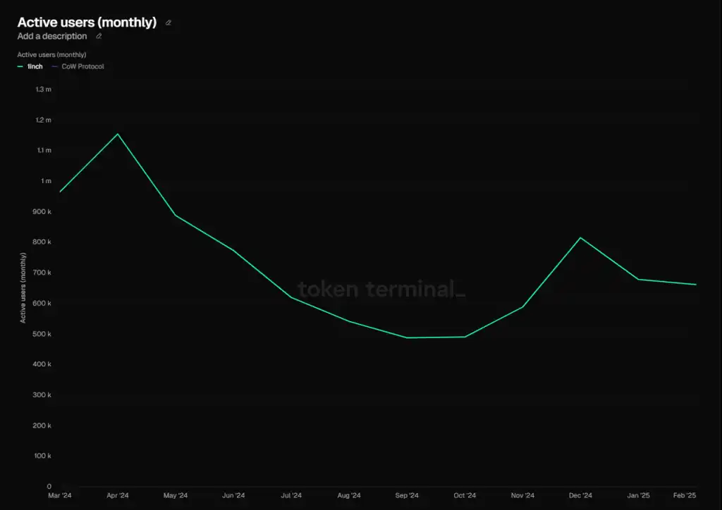 1inch 过去一年的月活跃用户,数据来源:Tokenterminal