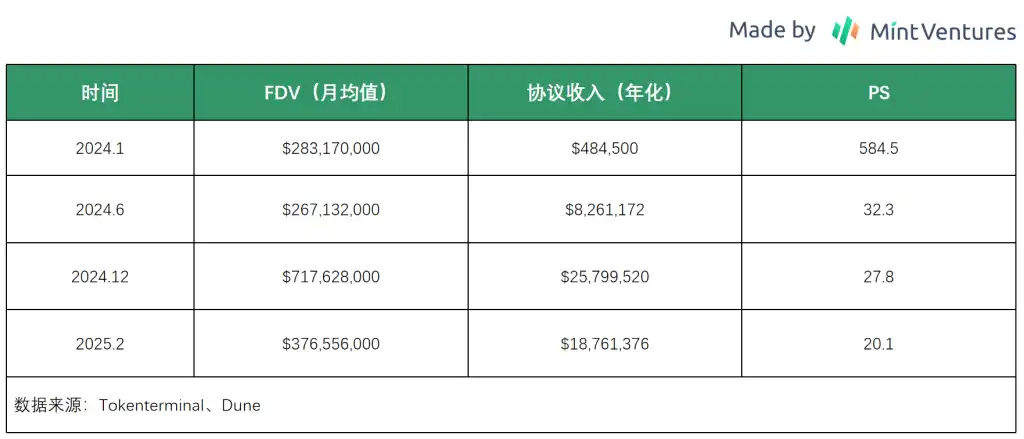 依据 DeFillama 收集的 Jupiter 收入数据,2 月份 Jupiter 的收入为 3170 万美元,年化收入为 3.8 亿美元,对应 PS(流通)仅为 3.65,PS(全流通)则为 9.5;而 3 月截止 18 日的收入为 1225 万美元,折算年化收入为 2.53 亿美元,对应 PS(流通)为 5.45,PS(全流通)为 14.15。