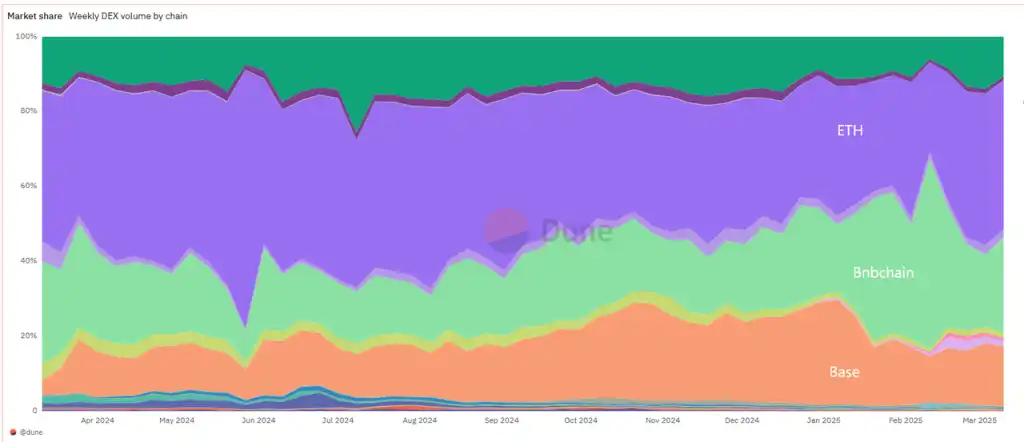而 ETH、Bnbchain、Base 也是 EVM 生态链交易量最大的三条链,与 Uniswap、Pancake、Aerodrome 的市场份额排名一致。