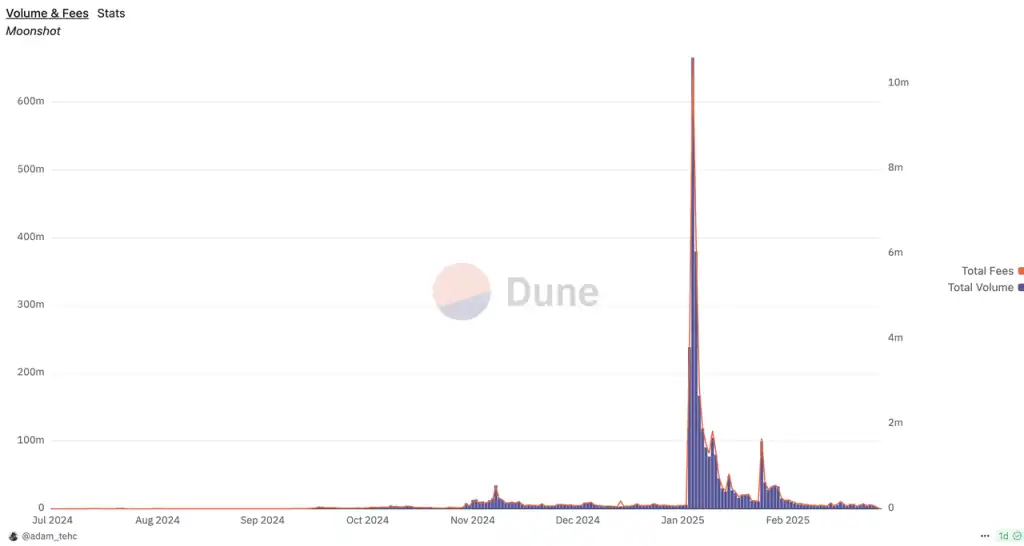 Moonshot 的交易量(左轴)和手续费(右轴)来源:Dune