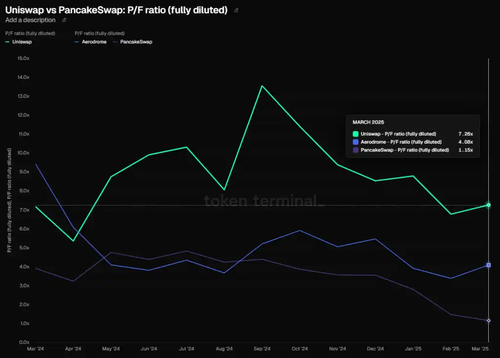整体来说,即使考虑到 Uniswap 与 Pancake 和 Aerodrome 业务的相似性,其 PF 横向估值对比的参考性是弱于纵向对比的参考性的。