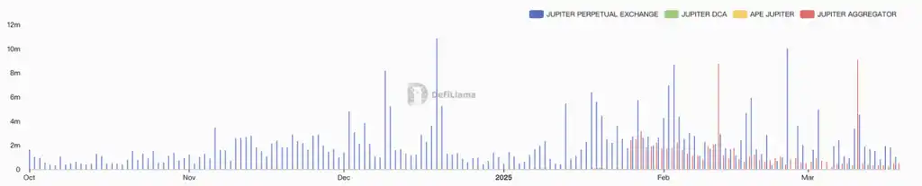 下图是 DeFillama 统计的去年 10 月以来的 Jupiter 协议收入(其中对 Jupiter 聚合器收入的统计在 2 月 10 日和 3 月 10 日的异常值可能有误,但笔者目前没有找到对 Jupiter 收入统计的其他数据源),可以看出,Jupiter 目前的主要收入仍然来自衍生品交易(蓝色柱),当然,这与 Jupiter 聚合器收费上线时 Meme 交易热情已经大幅度下降不无关系。