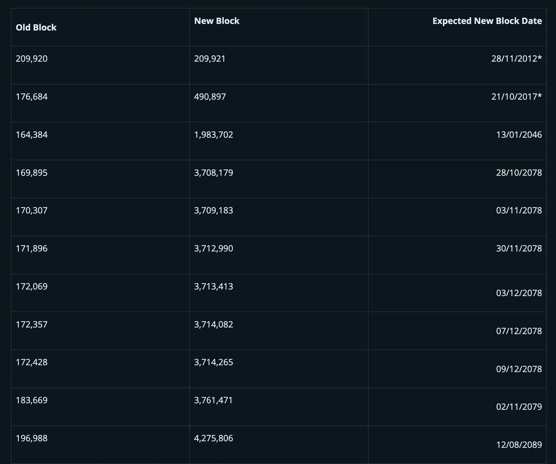 *注:这些区块已在 2012 年和 2017 年产生 Coinbase 交易并非重复。209 921 个区块(距离第一次减半仅差 79 个区块)不可能是重复的,因为 BIP30 在此期间得到了执行。