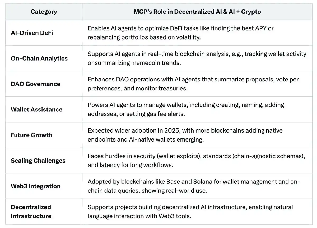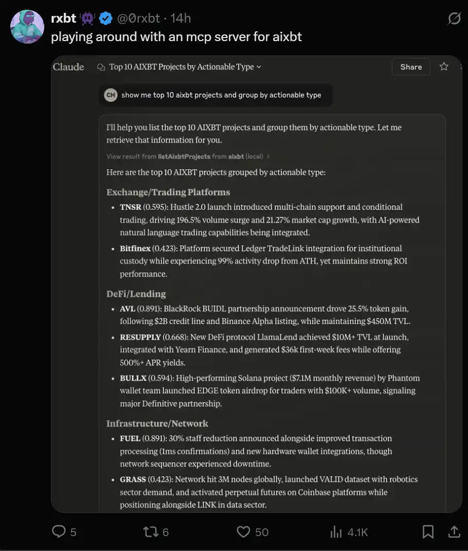 我们已经开始看到在 DeFAI 解决方案方面的推动,例如 @danielesesta 的 @heyanonai、@LimitusIntel 或 @gizatechxyz,以及通过自定义工具如 @aixbt_agent 解决链上分析问题。随着 MCP 在更广泛的加密和 AI 生态系统中的进一步整合,预计会有更多类似的创新出现!