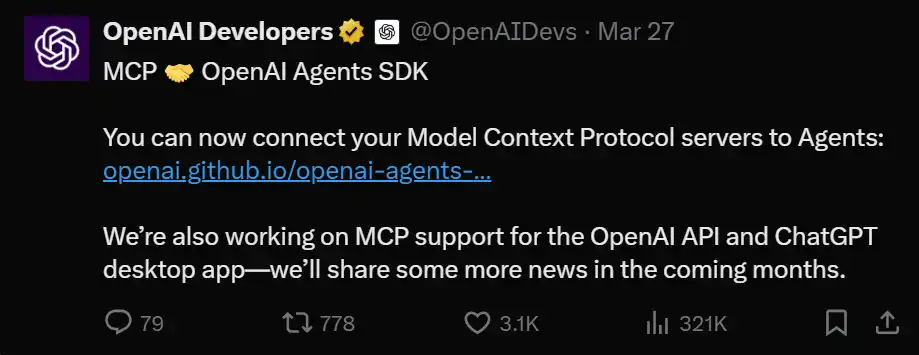 最近(事实上是昨天),OpenAI 发布了其自有的 MCP 插件,集成到其 Agents SDK 中: