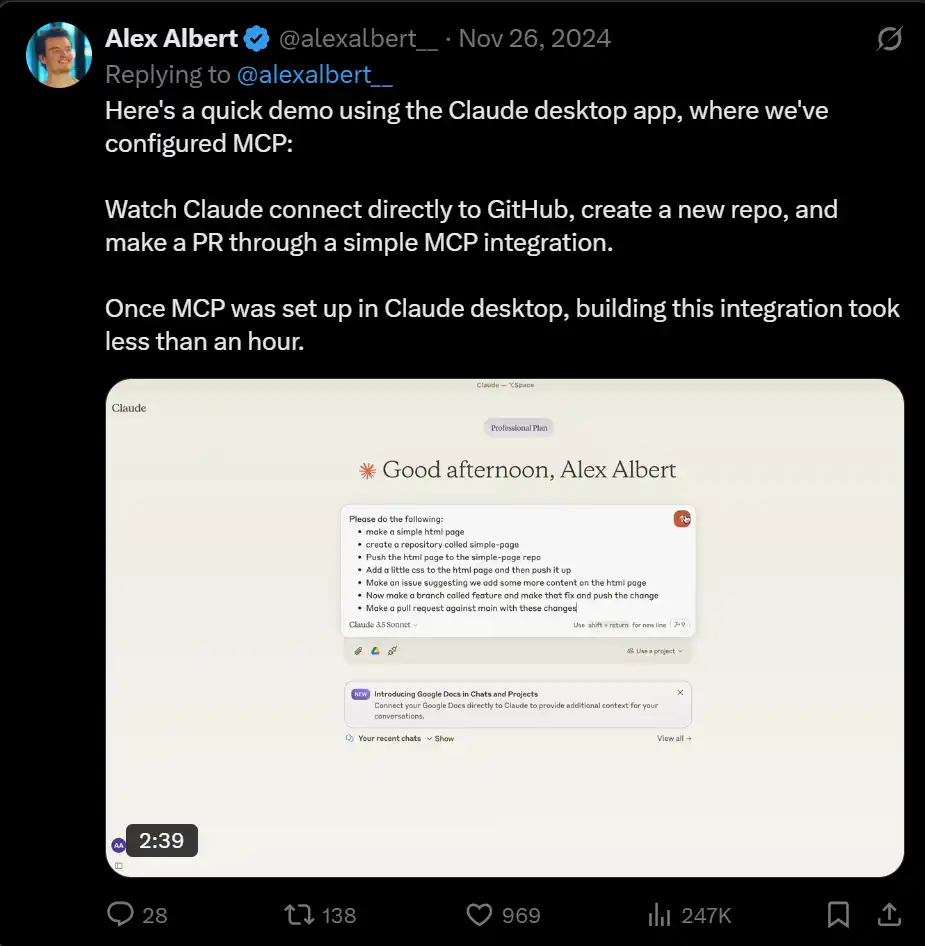 在下方示例(感谢 @alexalbert__),可以看到 Anthropic 的 Claude 直接连接 GitHub,创建新代码库,并使用 MCP 进行自动 PR(拉取请求)!