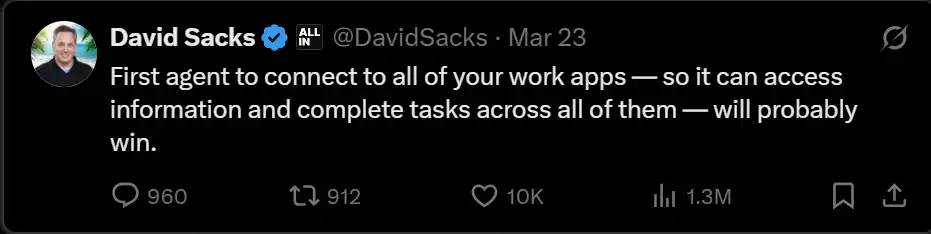 MCP 为 @davidsacks 提出的「终极 AI 代理」的构想提供了一个可行的解决方案: