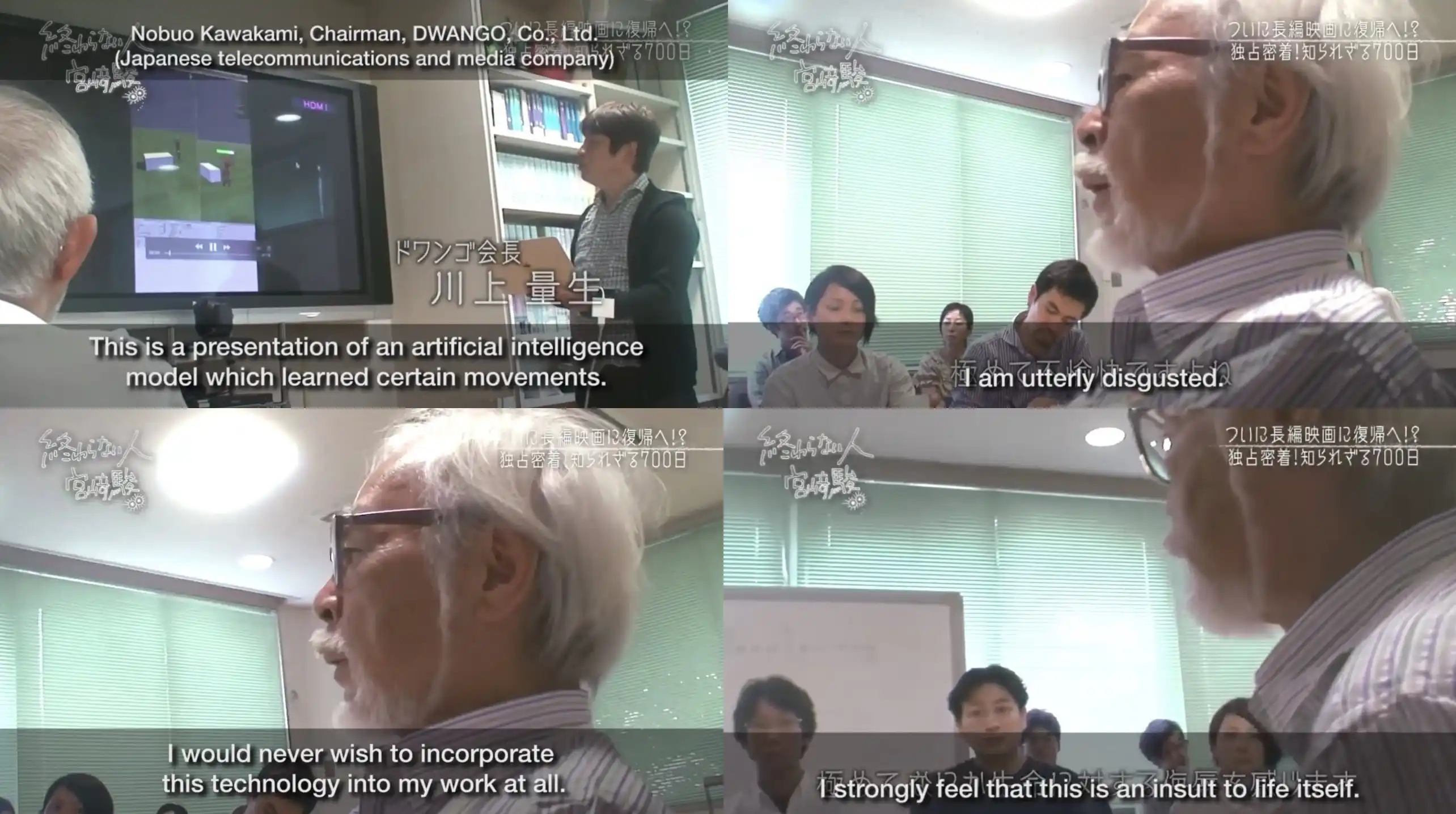 又或是搬出宫崎骏曾对 AI 技术表达的厌恶以此讨伐 Open AI 的不道德性。流传最广的一段话是宫崎骏在一次 AI 生成演示中说「我感到极度厌恶,完全不愿在我的创作中使用这项技术。我坚信,这简直是对生命本身的侮辱。」