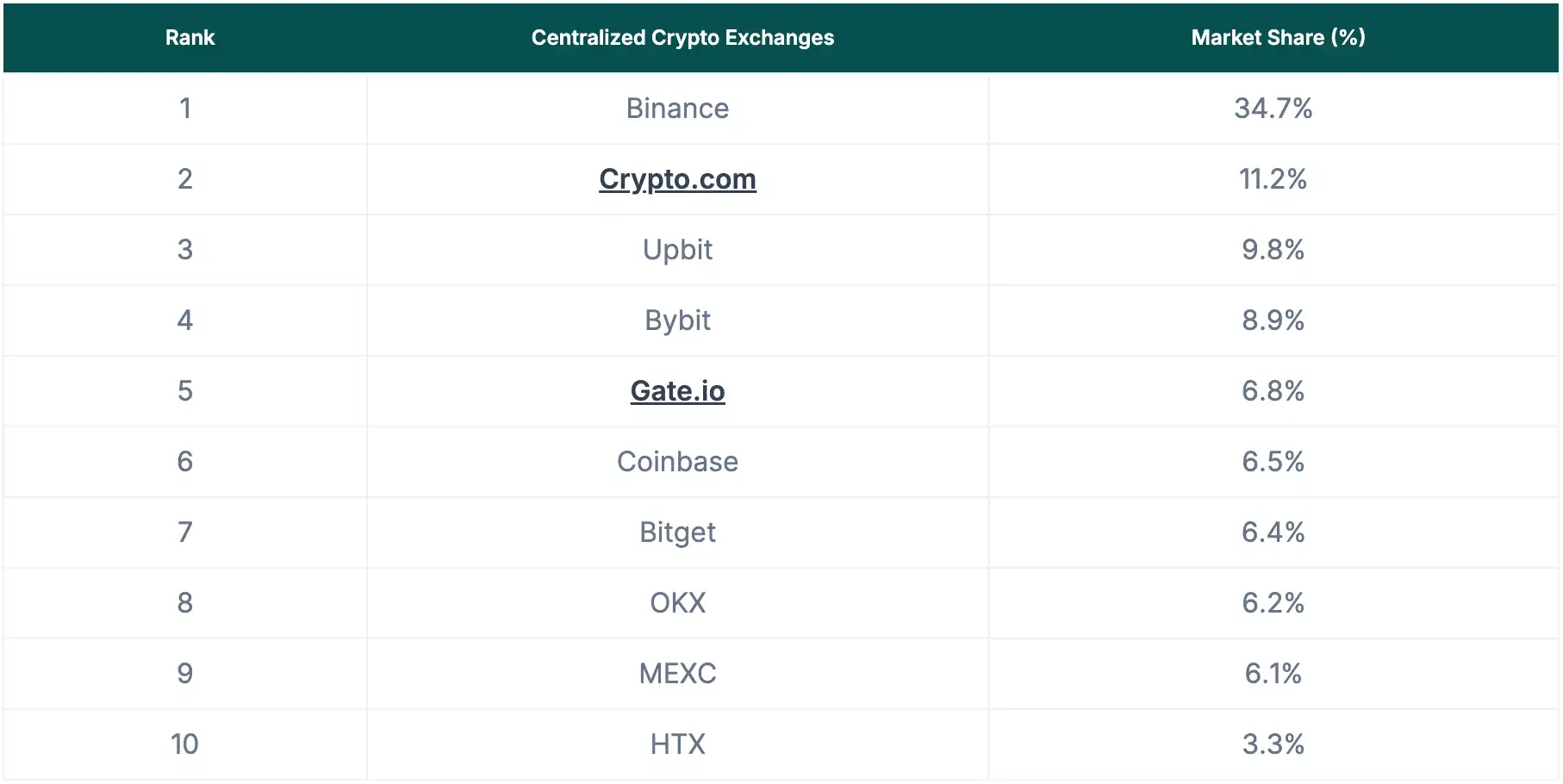 在市场份额方面,头部交易所依然占据主导地位。Binance 作为全球最大的中心化交易所,其在 2024 年 12 月的现货市场份额高达 34.7%,凭借强大的技术实力、丰富的交易产品以及广泛的用户基础,继续巩固其市场领导者的地位。紧随其后的是 Crypto.com,其市场份额为 11.2%,而 Upbit 则以 9.8% 的市场份额位居第三。