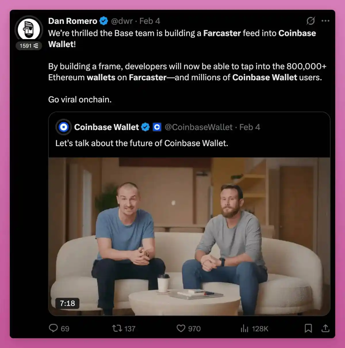 我相信在 Snapchain 上线并且 Farcaster 准备好扩展后,Coinbase x Farcaster 将开始宣布与 Coinbase 钱包的集成。