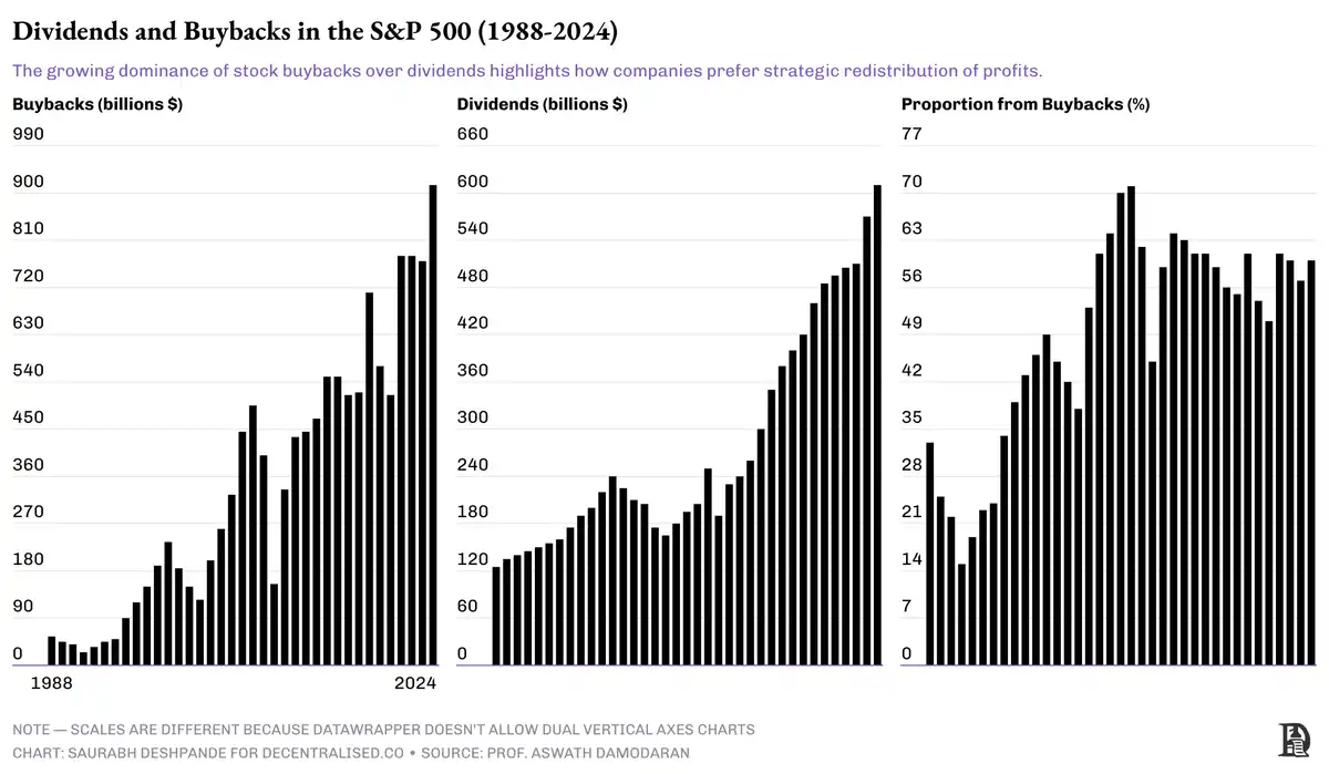 自 1990 年代以来,回购在利润分配中的占比已从约 20% 上升至 2024 年的 60%。从 美元总量来看,回购自 1999 年以来已超越派息,成为企业更偏好的利润回馈方式。