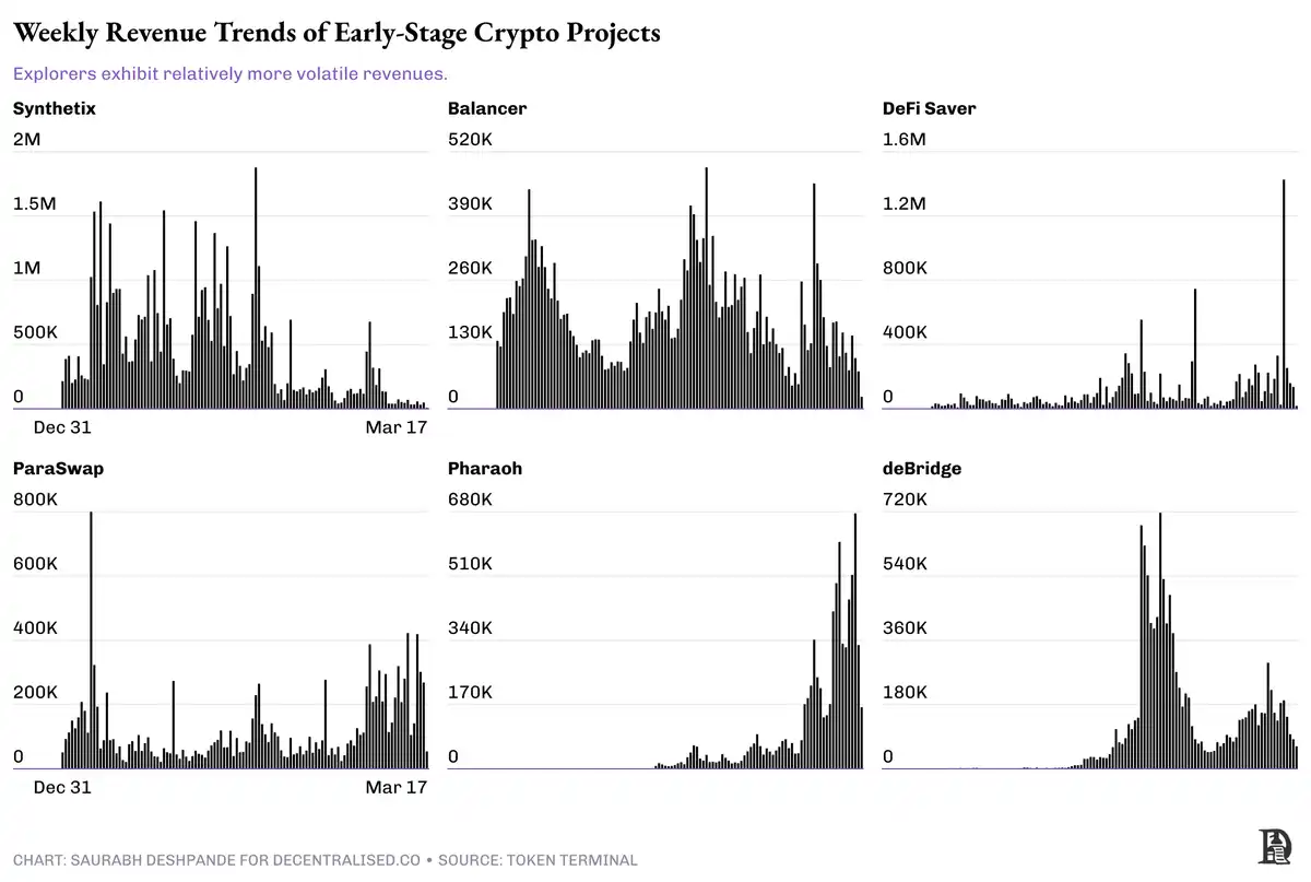 比如 Synthetix 和 Balancer 这类项目,已经存续了约 5 年,目前每周收入在 10 万至 100 万美元之间,在市场活跃时会出现异常峰值。这种剧烈的涨跌并非失败的迹象,而是早期阶段的特征。真正重要的是,这些团队能否把实验成果转化为稳定的用户需求。