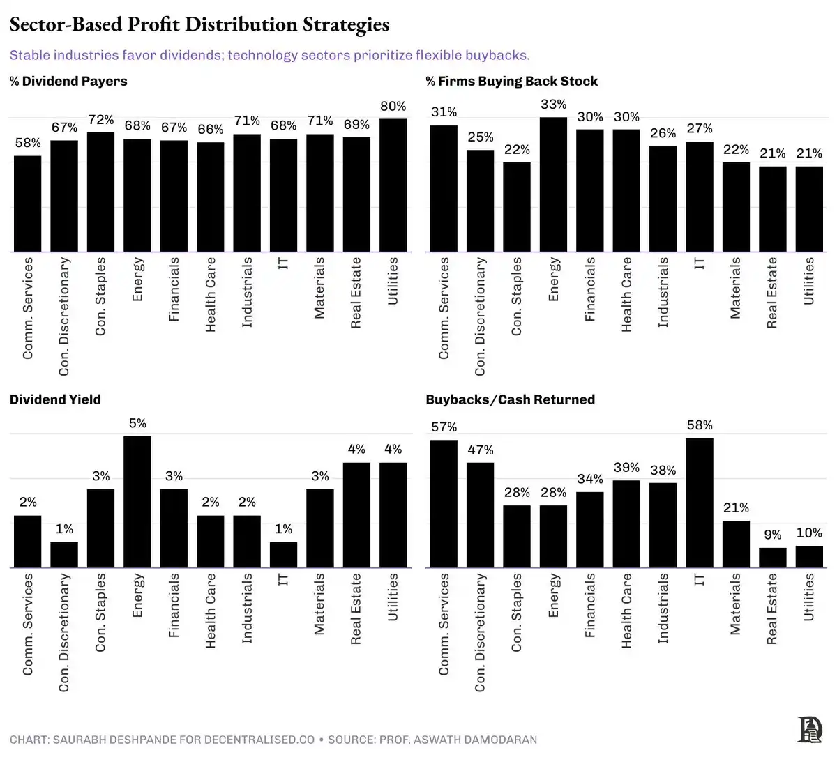 派息(Dividends)具有刚性——一旦承诺派息,市场就会期待持续稳定的分红,企业很难随意调整。回购(Buybacks)更具灵活性——团队可以根据市场周期或代币的低估情况来调整回购时机,更有策略地进行价值分配。